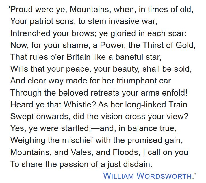 Jedan od pionira turizma, poznati pjesnik William Wordsworth, 1844. napisao je poemu „Ponosne ste bile planine, kada ste u davna vremena“ u kojoj je s nepatvorenim užasom prikazao raspad seoske idile i nestanak ljepota planina i brda sjeverne Engleske. Pjesnik dolazak željeznice i navalu turista vidi kao kraj jedne ere, kao oskvrnjenje krajolika koji je u svojoj ljepoti gotovo svetinja. “Vaša ljepota bit će prodana, put očišćen za trijumfalnu kočiju”, piše Wordsworth, pozivajući planine i doline da prihvate novo doba s “pravednim prezirom”.